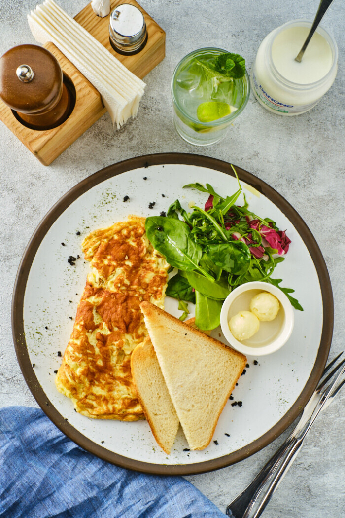 - Омлет с микс-салатом, крутонами и сливочным маслом