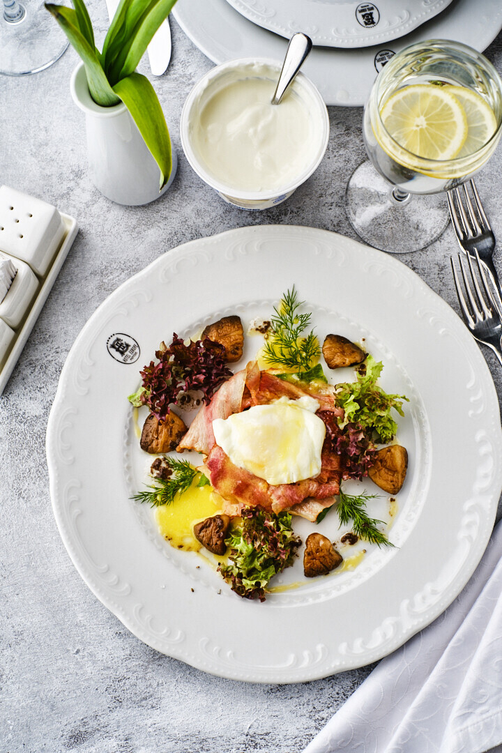 - Яйца Бенедикт с беконом, шпинатом под соусом «Холландейз»