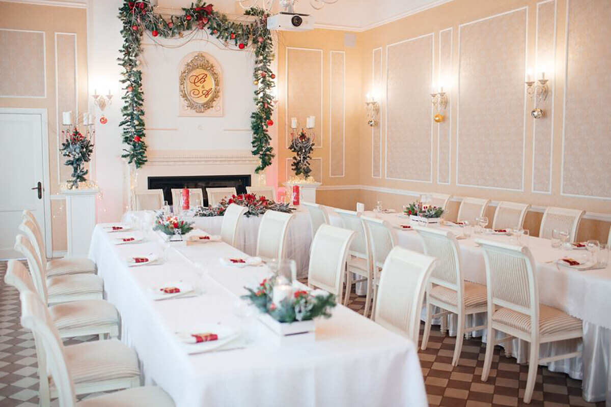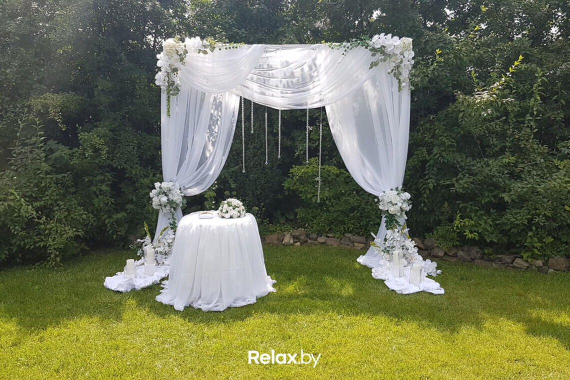 Расположенная на высоком берегу реки Березины, усадьба «Красное» является восстановленным дворянским имением Незабытовских. Старинный дом, где проходят торжества, оформлен в классическом стиле и даже без декора выглядит празднично. К услугам гостей — скатерти, вазы, можно также взять напрокат 20 белых стульев, которые ставятся перед аркой во время выездной регистрации. К слову, для самой церемонии в усадьбе есть отдельное живописное место: над рекой под старыми деревьями. На террасе же расположится музыкальное оборудование.