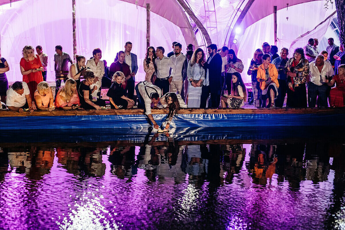 На второй день свадьбы в усадьбе предлагают развлечения на воде на любой уровень физической подготовки: сплав на байдарках на 1,5-2 часа, катание на SUP-досках, баня на плоту, с которой ныряют в реку.