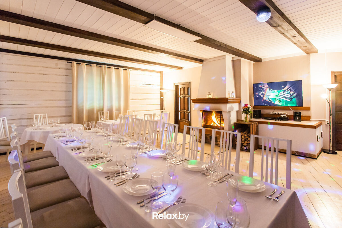 В банкетном зале есть камин, а рядом с домом — баня на дровах, две большие беседки с камином и мангалом, вмещающие до 70 человек.