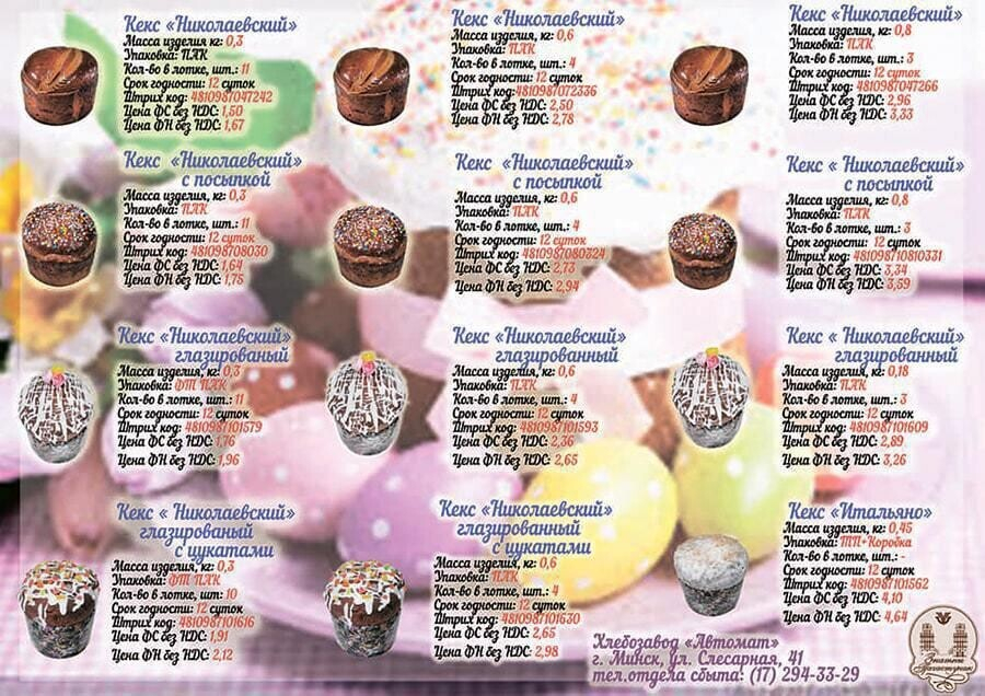 Кулич «Зайцы-яйца» (вяленая вишня, цукаты) — 12 рублей; - Пряник Пасхальный (медово-пряничное тесто) — 4 рубля;