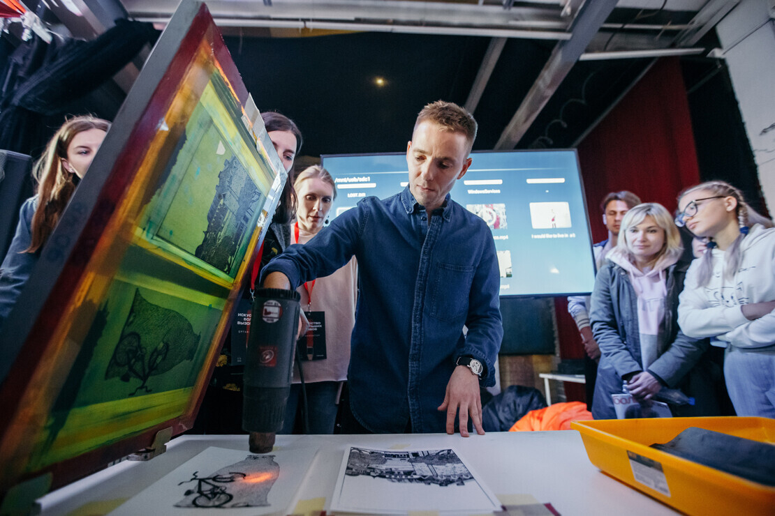 Митя Писляк провел мастер-класс по гравюре, нанесенной на бумагу с помощью техники шелкографии. Каждый желающий смог получить авторскую гравюру в подарок.