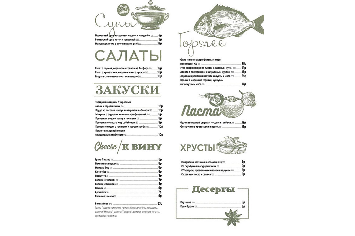 — В прошлом году у нас было довольно обширное обеденное меню с ценником 12 рублей за три блюда. Сейчас мы решили пойти по другому пути: не просто покормить гостя, а предложить ему атмосферу, сервис и позиции на порядок выше, нежели просто гарнир и котлета где-нибудь в бистро.