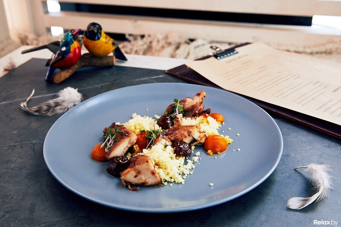 Блюдо имеет особую глазурь из соуса унаги. Подается с кускусом, задача которого — все объединить.