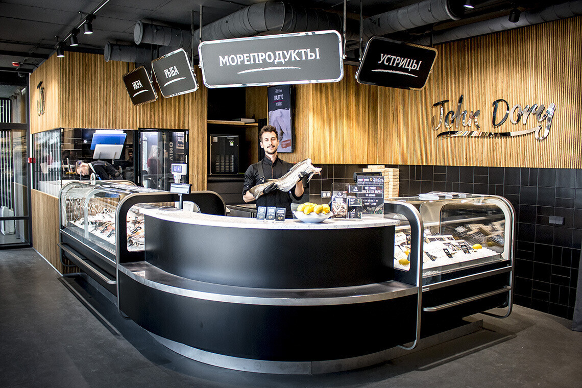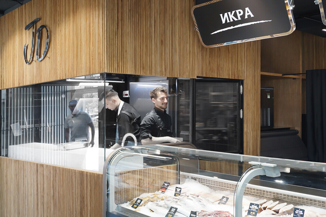 Новый магазин разделен на функциональные зоны. Торговый зал с холодными витринами здесь дополнен барной стойкой. А рыбу в магазине разделывают на глазах у покупателей: продукт можно выбрать и продегустировать на месте.
