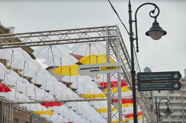 32-метровая инсталляция на улице Комсомольской — результат присоединения Беларуси к Umbrella Sky Project — акции, в рамках которой улицы с десятками зонтов сооружаются по всей Европе. Обновленному участку «пешеходки» уже присвоили неофициальное название «Комфортная аллея».