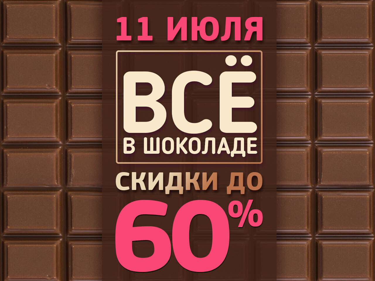 Только 11 июля и только в сети торговых центров компании ООО «Евроторг» вас ждут сладкие, как шоколад, предложения: скидки до 60% в магазинах, расположенных в ТЦ, а также скидка 25% на шоколад и кондитерские плитки в гипермаркетах «Евроопт».