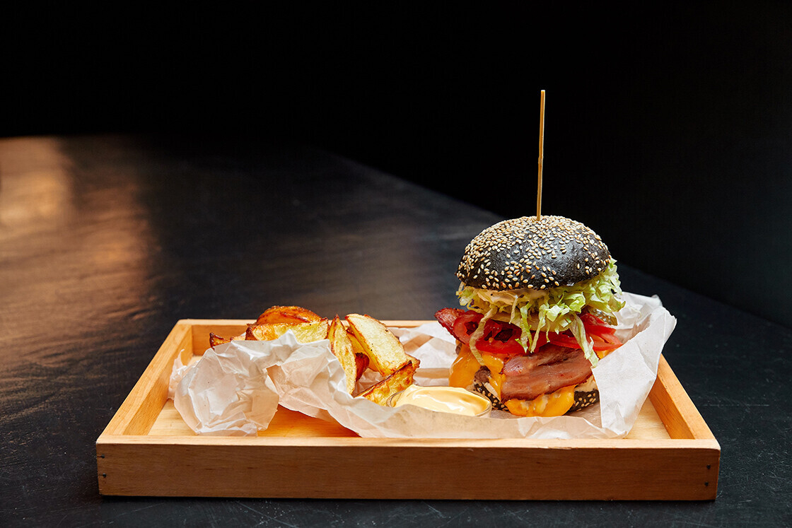В набор входят не только необходимые ингредиенты — черные булочки с кунжутом, котлета из сочной говядины, свежие овощи, но и ломтики картофеля с нежным беконом и двумя видами соусов.