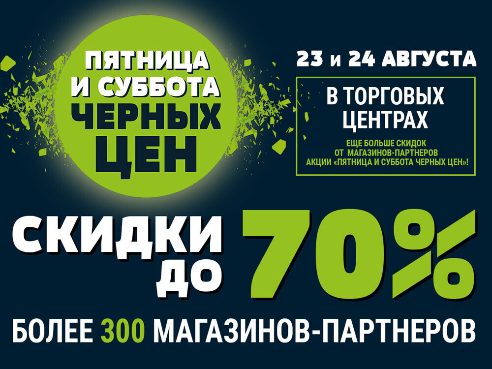 В торговых центрах «Евроопт» и «Е-сити» 23 и 24 августа пройдет акция «Пятница и суббота черных цен». В эти дни вы сможете присоединиться к празднику шопинга и совершить покупки в более чем 300 магазинах-партнерах со скидками до 70%.
