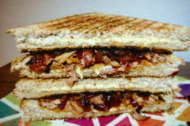 - Состав: обжаренный тостовый хлеб, томленная 48 часов говяжья лопатка, соус на основе корений, томатов, портера и крепленого Порто, лук, маринованный огурец, бекон, сыр чеддер и фри с паприкой и пармезаном
