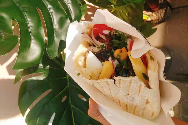 - Состав: пита с баклажаном, картофелем и яйцом, овощами, зеленью и красным луком, хумусом и тхиной.