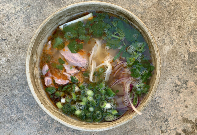 - Состав: крепкий говяжий бульон с пряностями, говядина, рисовая лапша, свежая зелень, лайм и чили масло