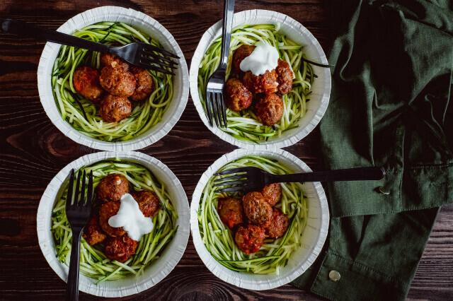 - Состав: митболы в томатном соусе, лапша из свежего цукини, соус на основе йогурта