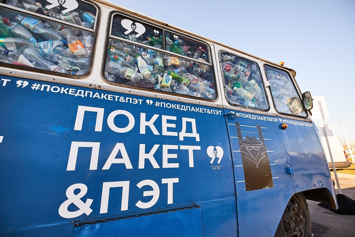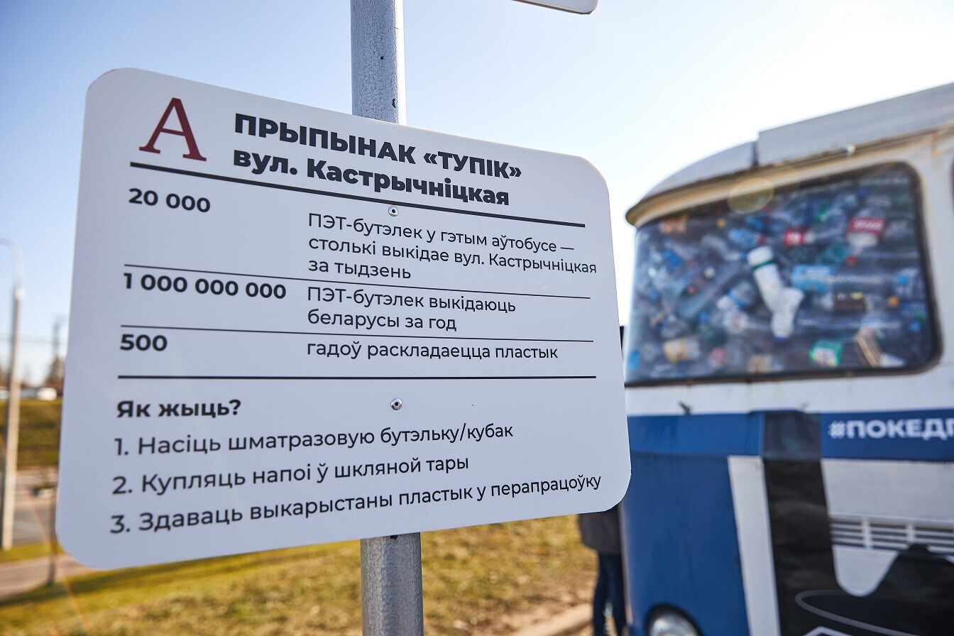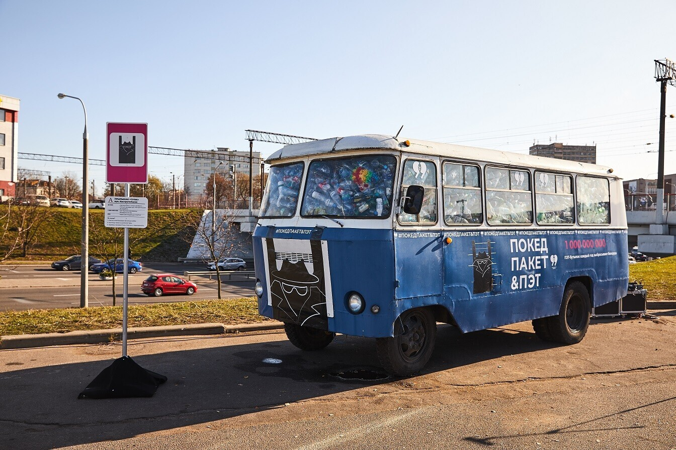Объем выбрасываемого пластика за неделю стал наглядным благодаря компании «Наша Победа», предоставившей ретроавтобус, и предприятию «Минскоопвторресурсы».
