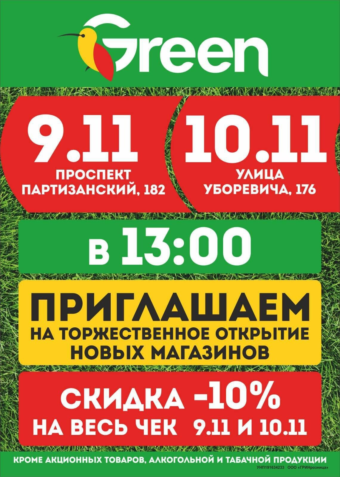 Новые магазины Green («Грин») откроются 9 ноября на Партизанском проспекте, 182 и 10 ноября на улице Уборевича, 176.