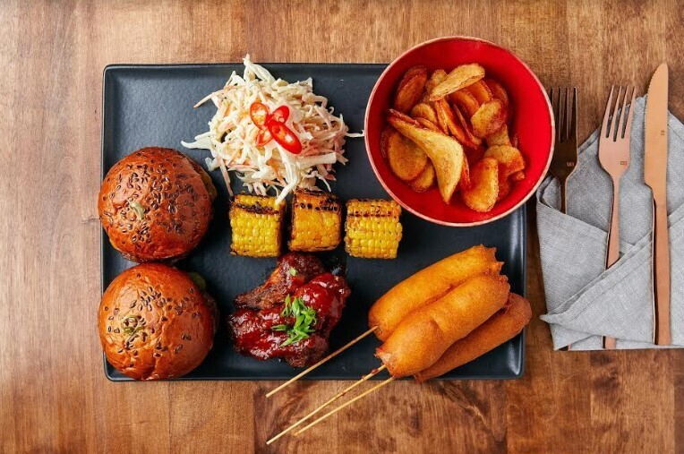 Два крафтовых бургера с соусом Dr. Pepper, корн-дог с куриными колбасками, пикантные куриные крылья в фирменном соусе, салат коул слоу, обжаренная на гриле с травами кукуруза и домашние картофельные чипсы.
