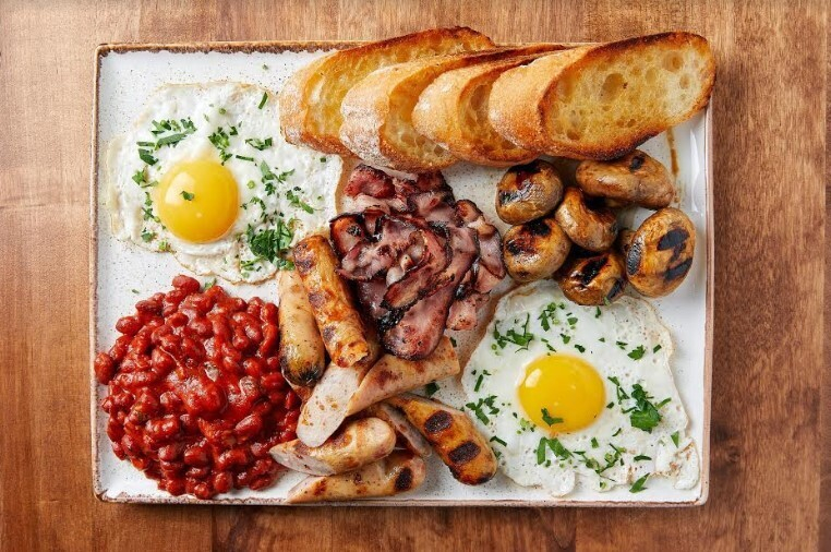 Яичница глазунья, куриные колбаски, копченый бекон, обжаренные на гриле с травами шампиньоны, красные бобы с базиликом и слайсы обжаренного багета.