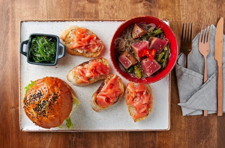 Брускетта с форелью собственного копчения на французском багете с фета, вялеными томатами и свежим базиликом; салат с обжаренным желтоперым тунцом на гриле, фунчозой, спаржей и лаймово-кунжутной заправкой; авторский бургер с треской, маринованной в перечном соусе и обжаренной до хрустящей корочки, салатом айсберг, маринованными огурцами и домашним соусом тартар, салат хияши вакаме с лаймовой заправкой.