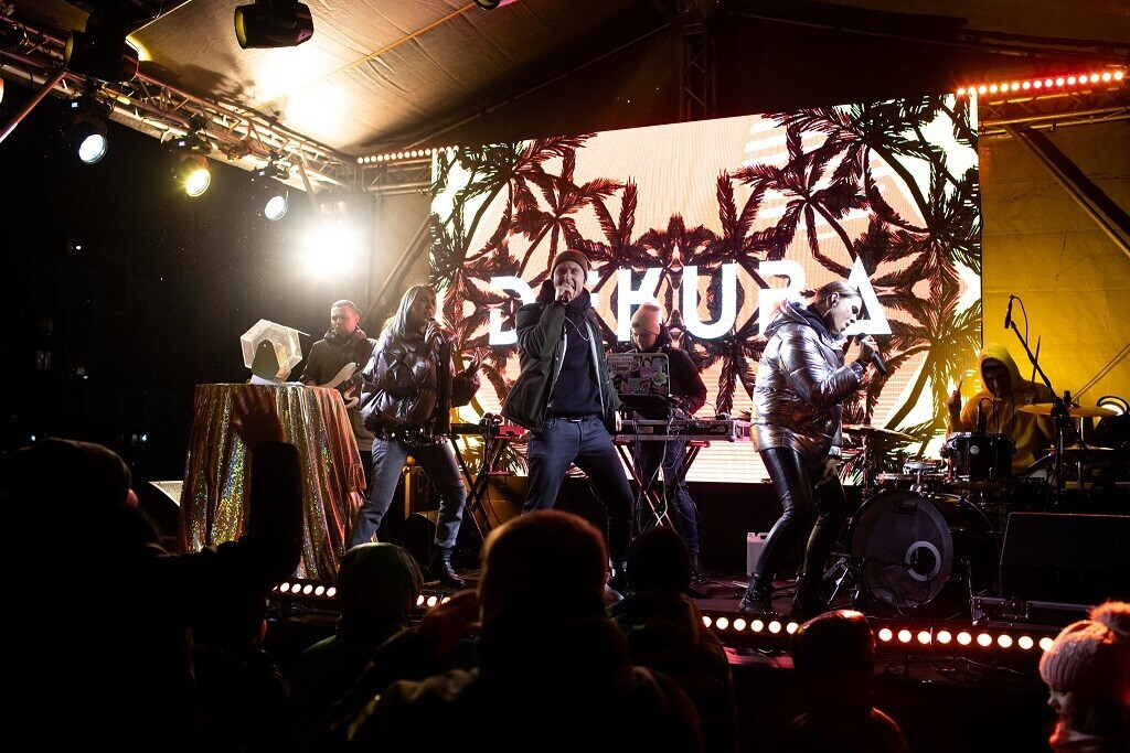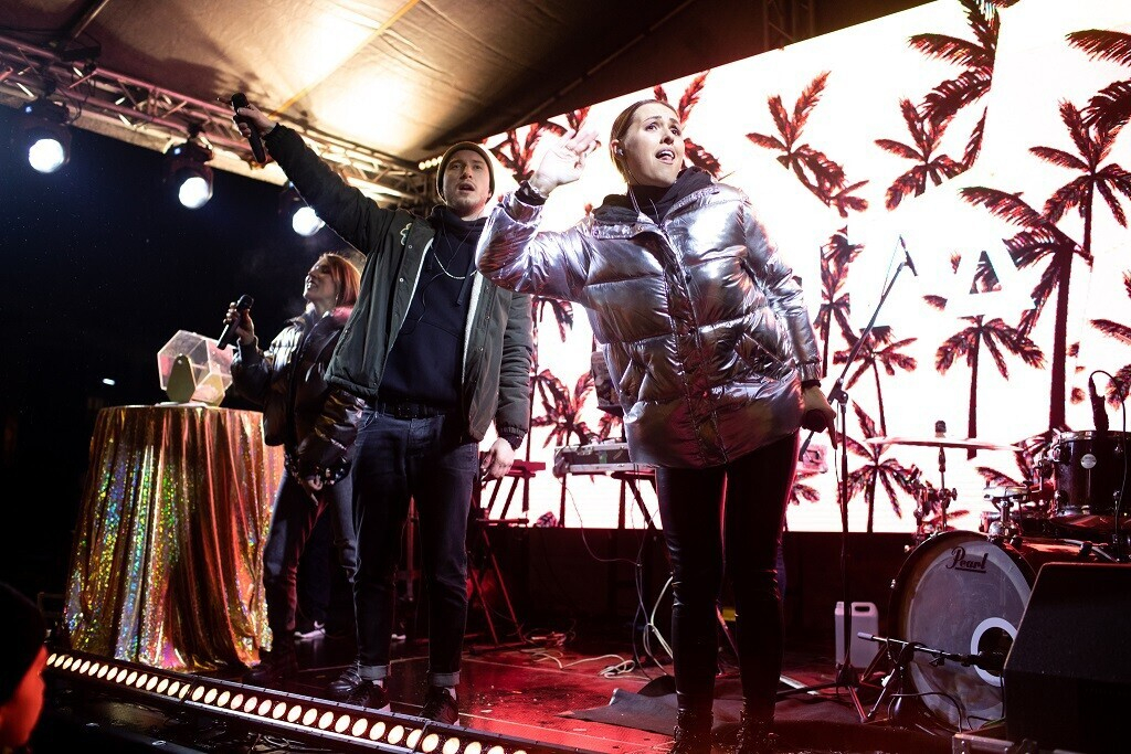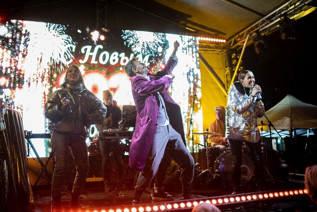 Первые минуты 2020-го собравшиеся встретили под рождественско-новогодние песни и зрелищный фейерверк. После чего стартовал праздник. Первым делом ведущий разыграл памятные призы среди держателей лотерейных билетов. Самым везучим достались 10 подарков от организатора мероприятия — застройщика «А100 Девелопмент».