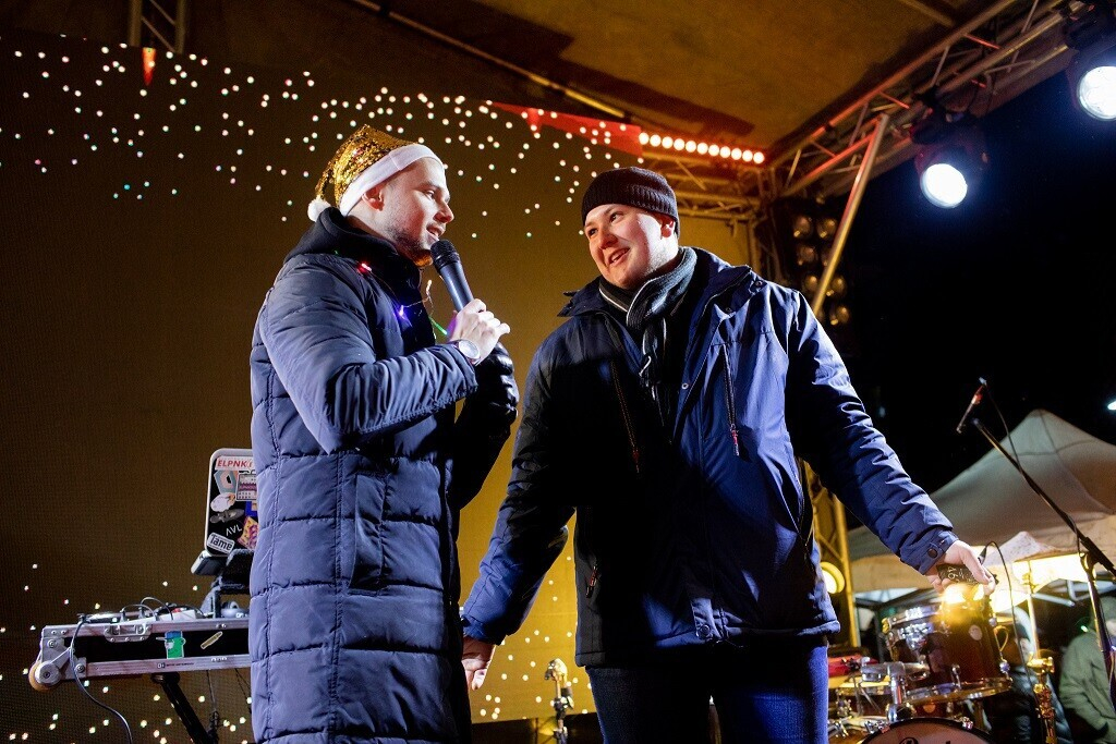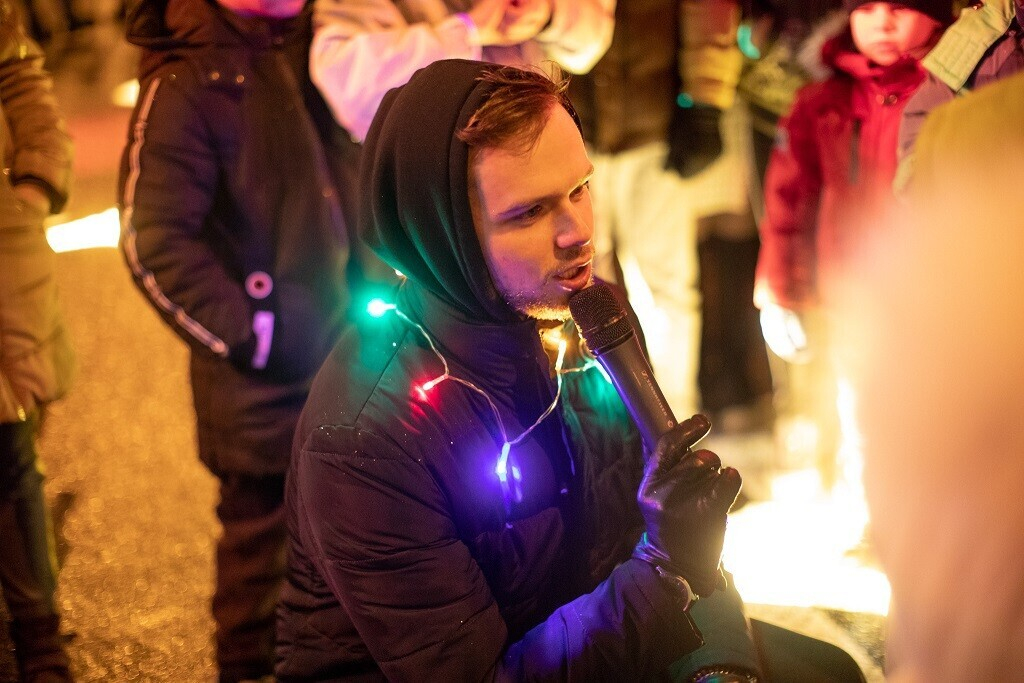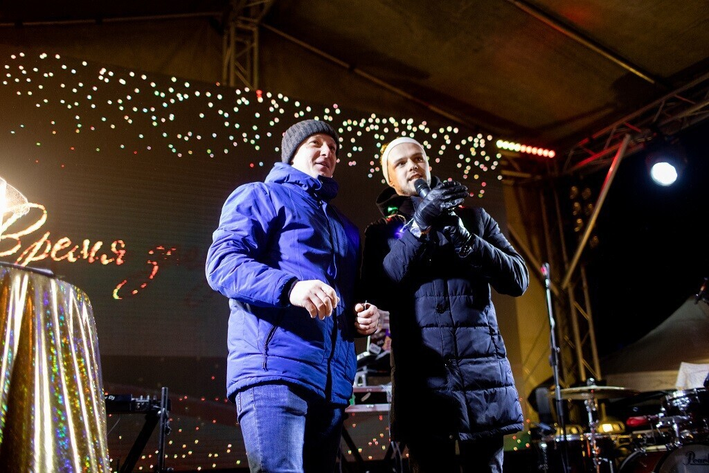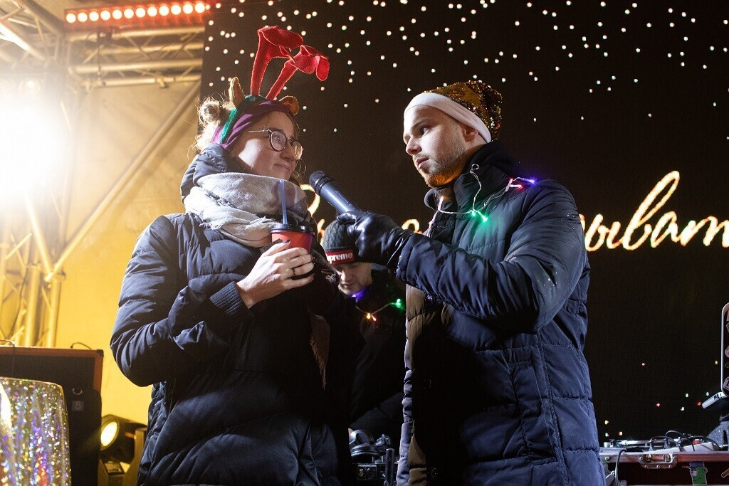 Первые гости начали подходить к сцене еще за полтора часа до боя курантов. Ведущий развлекал их шутками, принимал заявки на музыкальные треки. Внимание жителей привлек ведущего диалог с 12-летним мальчиком, который, как выяснилось, пришел на гуляния один.