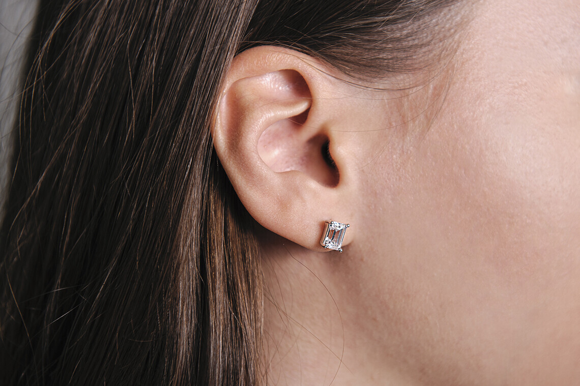 Серьги-гвоздики в оригинальной огранке «Радиант». Данный вид огранки камней сейчас наиболее актуален. Стоимость — 38,38 рублей с учетом скидки.