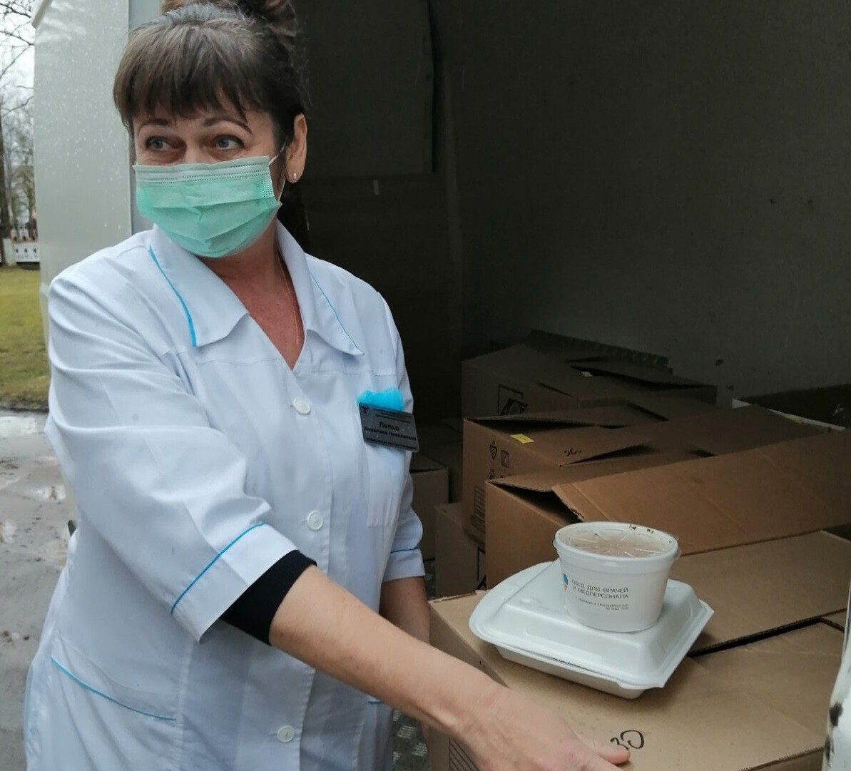 Бесплатные обеды готовит служба кейтеринга по заказу аптечных сетей ADEL и «Добрыя лекi». Повара работают ночью в перчатках и в масках. Еда пакуется в стерильные ланч-боксы и к полудню доставляется в больницу.