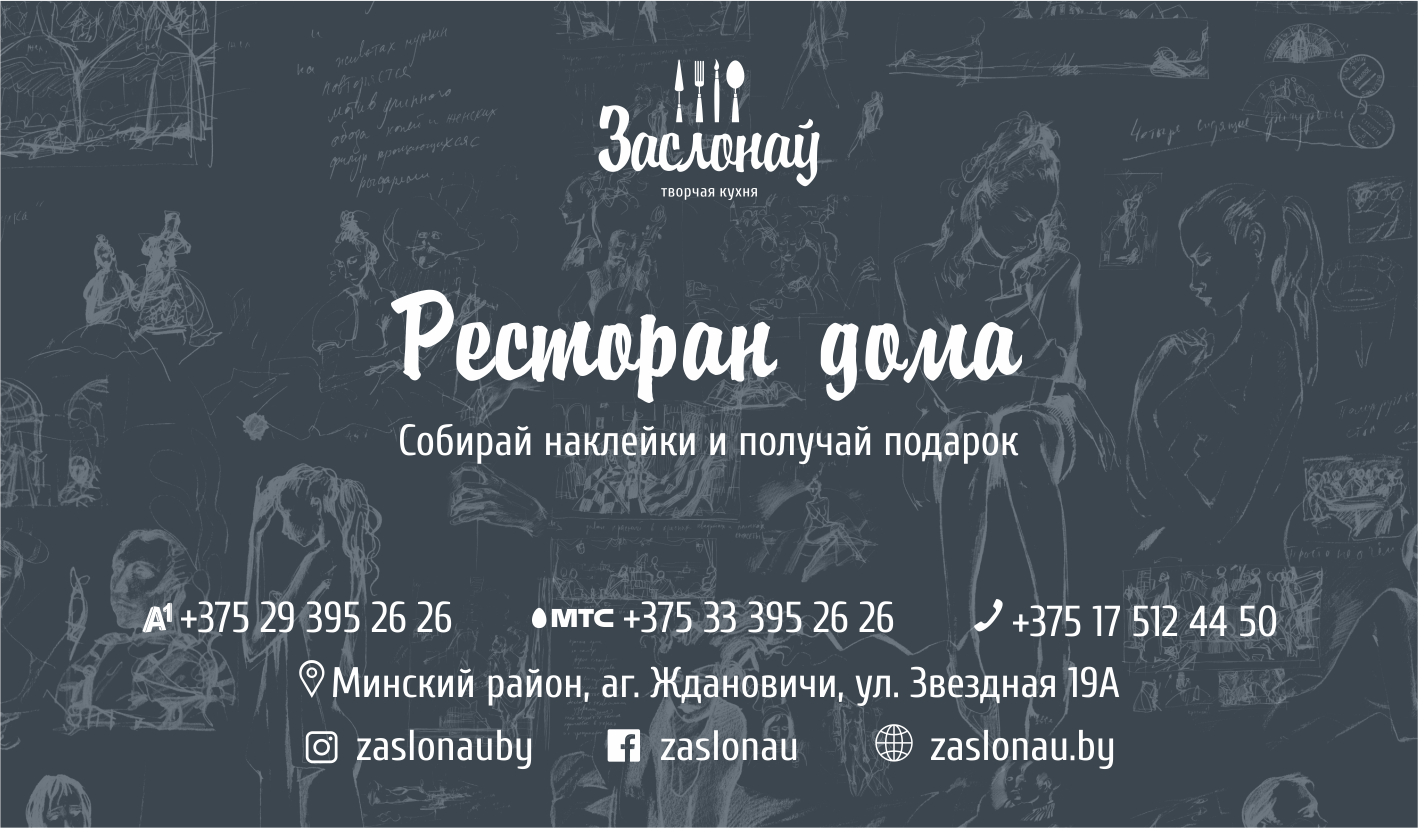 Ресторан «Заслонаў» запускает специальное предложение «Ресторан дома». Заказывая еду навынос, гость будет получать наклейки, которые сможет обменять на подарочный сертификат на 100 руб.