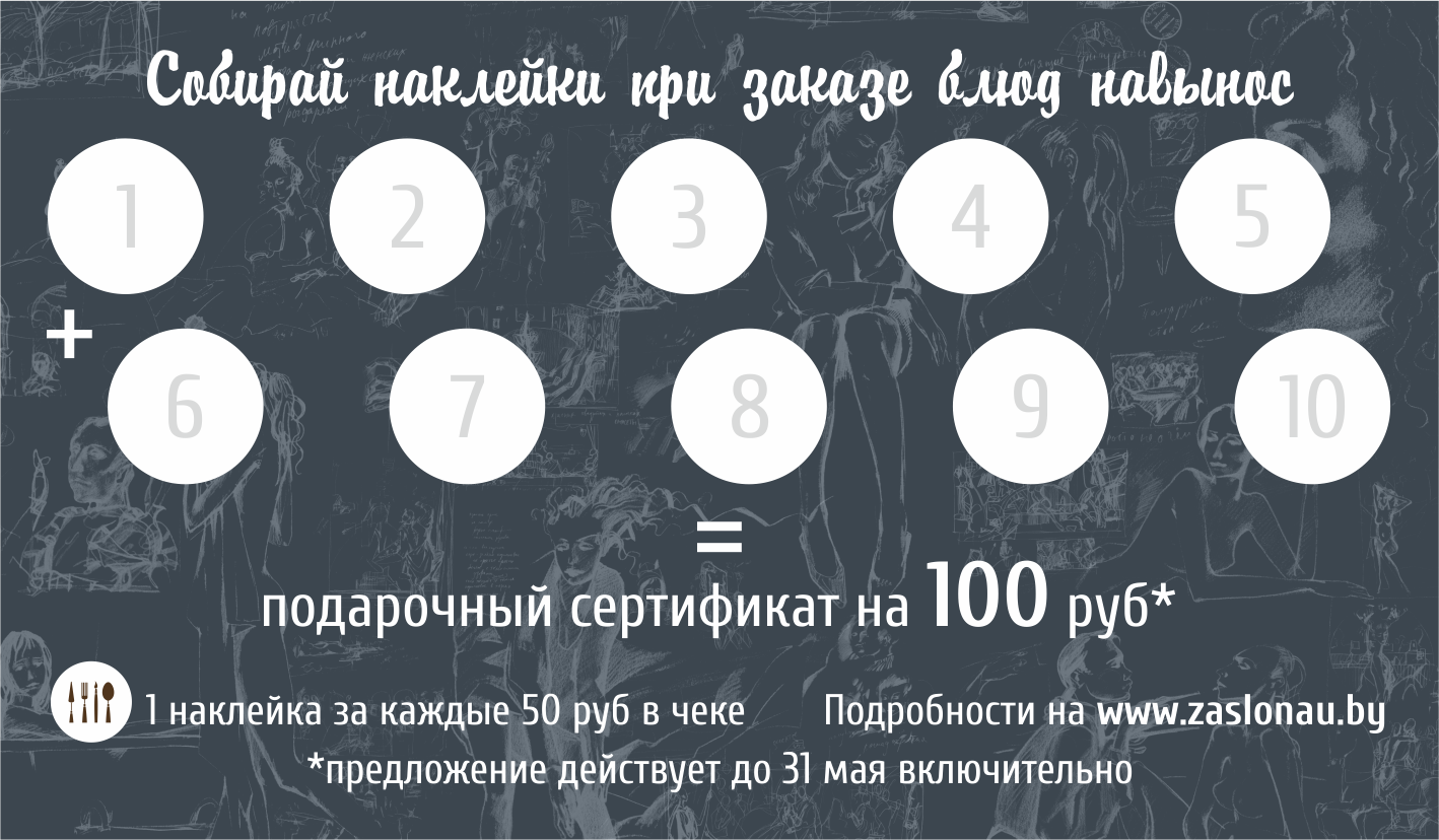 - Обменять заполненную карточку с 10 наклейками на подарочный сертификат номинальной стоимостью 100 руб. на посещение ресторана «Заслонаў».