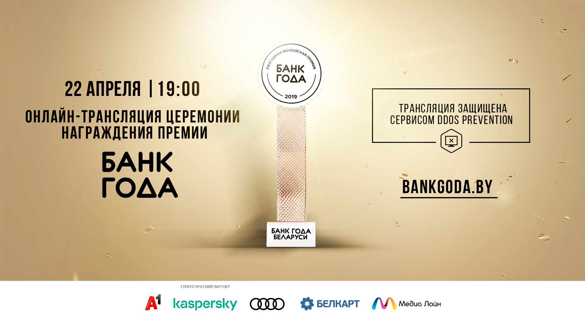 22 апреля 2020 года на сайте bankgoda.by пройдёт онлайн-трансляция пятой юбилейной Церемонии награждения победителей премии «Банк года-2019». Начало трансляции — 19.00.