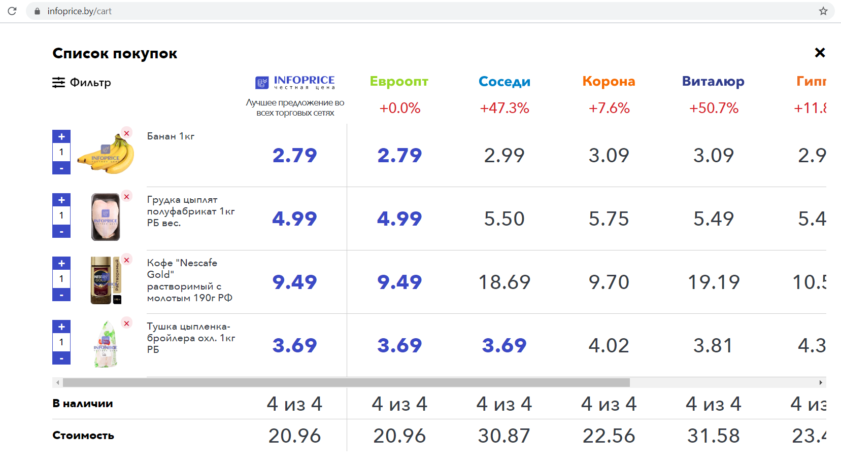 Цены для «умной» корзины отслеживают ежедневно. Мониторингом охвачено большинство торговых сетей: «Евроопт», «Соседи», «Корона», «Виталюр», «Гиппо» и Green. Для сравнения представлены и онлайн-гипермаркеты, но пока только «ХИТдоставкой».