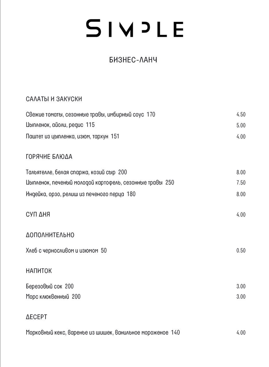 Начать неделю вкусно: Simple на Свердлова, 2 запускает бизнес-ланчи. Классическое время подачи с 12:00 до 16:00. Есть парковка. Столик можно забронировать по телефону +375-29-185-50-50 или написать в любые мессенджеры.