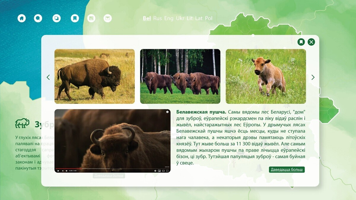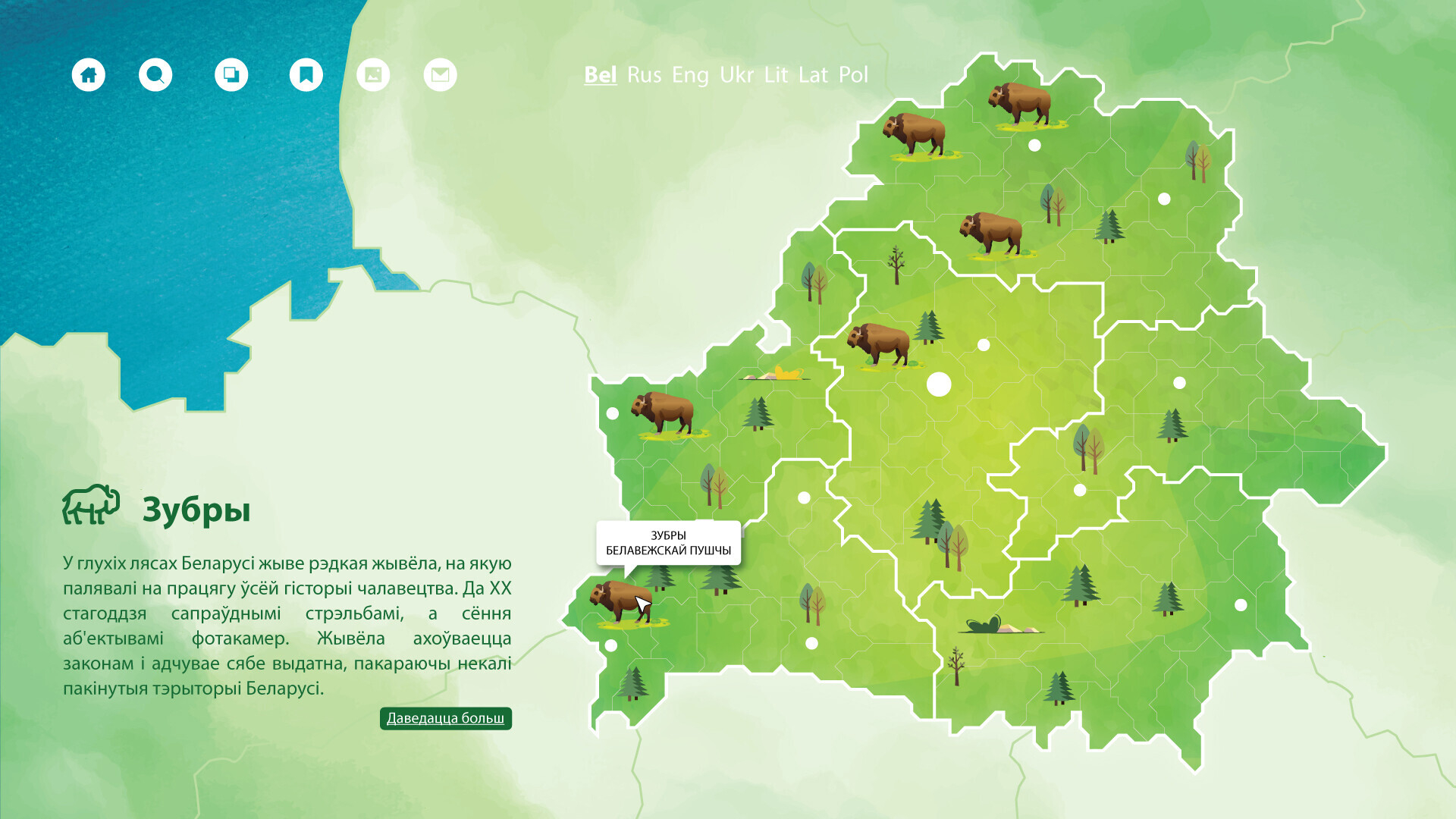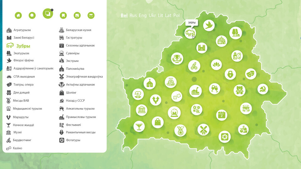 - Выбираем интересный слой, после чего изучаем места, которые показаны на карте Беларуси тематическими иконками (нажимаем на иконки, читаем короткую информацию во всплывающем окне, смотрим фото и видео).