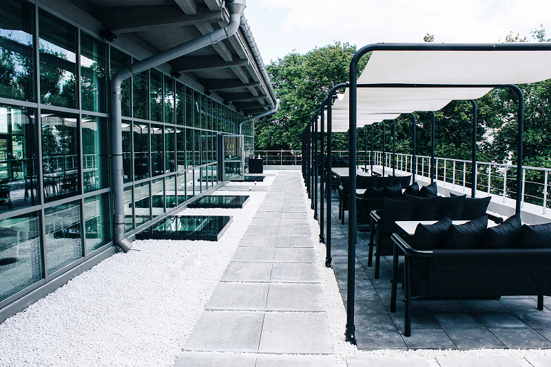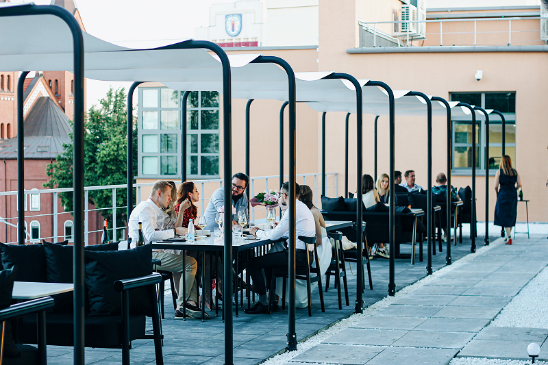 Одна терраса с видом на Красный костёл получилась в целом классического формата: столики и диваны в стиле основного зала Simple, чёткая геометрическая конструкция из металла и белые воздушные тенты от солнца. Вторая терраса с видом на Пищаловский замок пока в процессе доработки. Здесь, по словам Влада, появится сад-огород, в котором будет лишь один большой коммунальный стол для проведения тематических ужинов.
