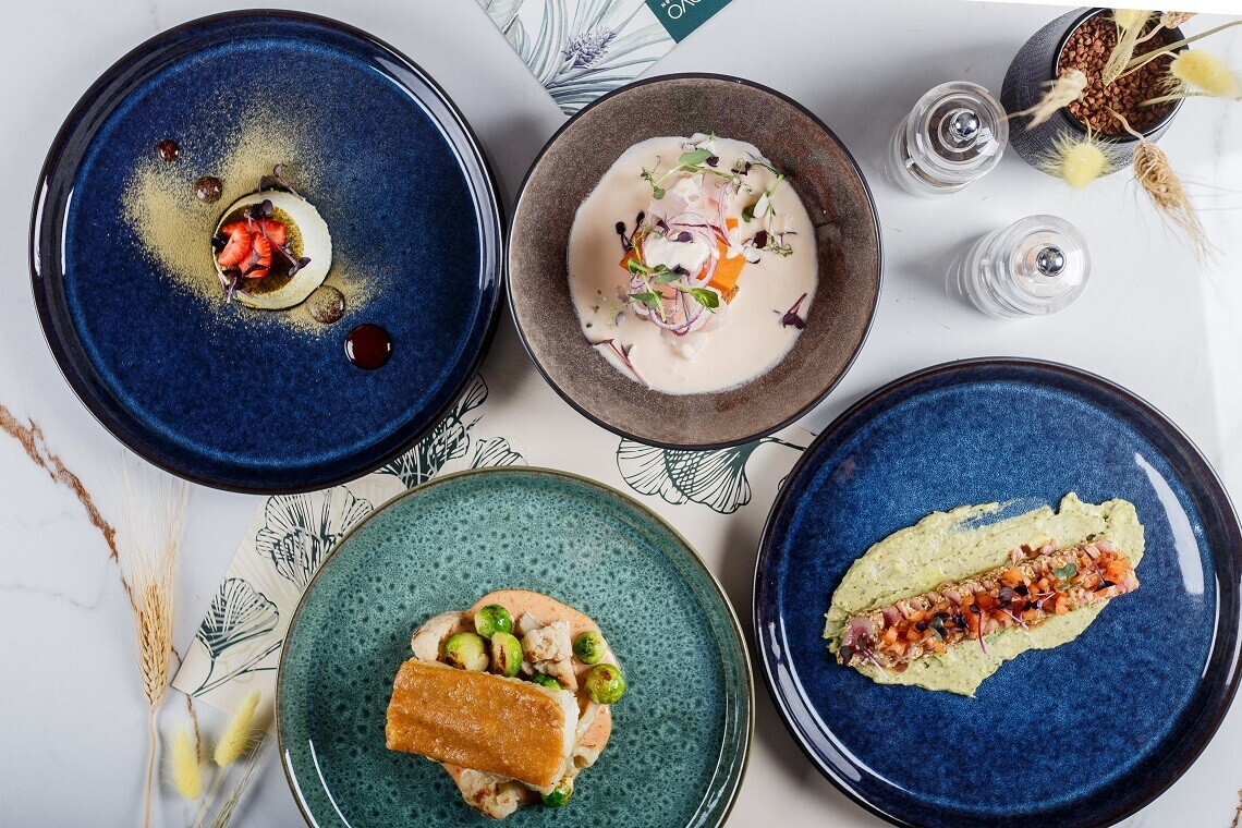 - Севиче из форели, розовая вода, кокосовый пломбир