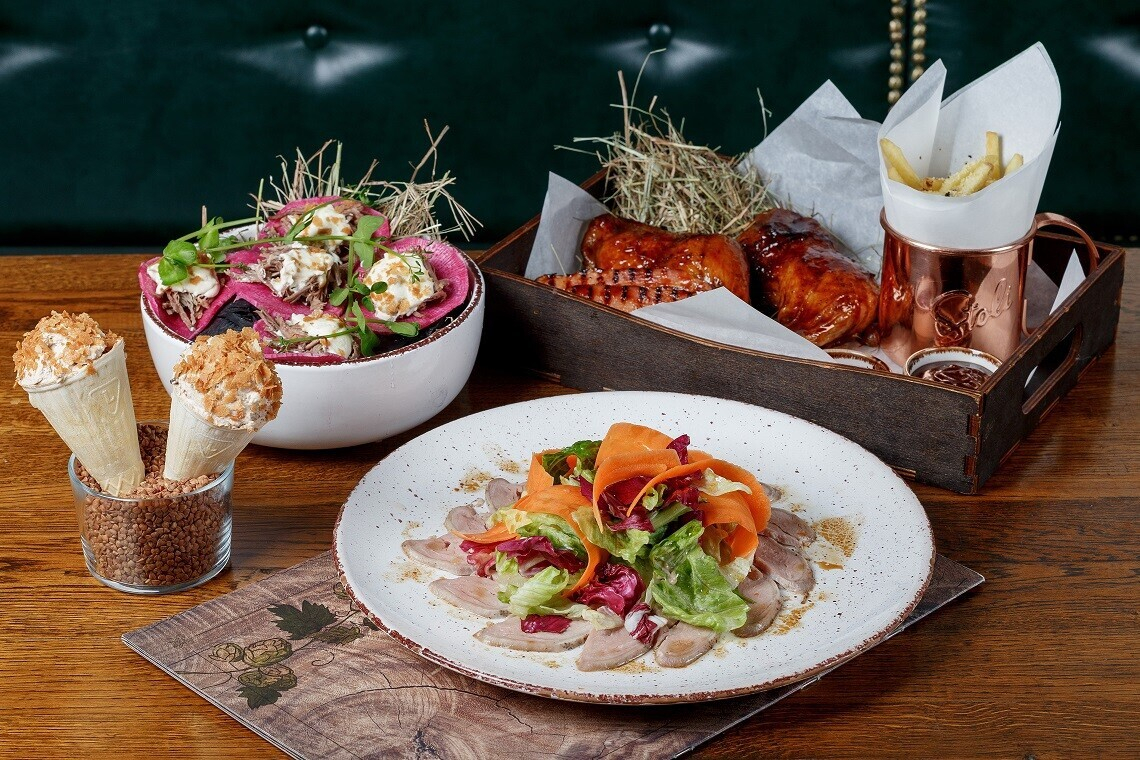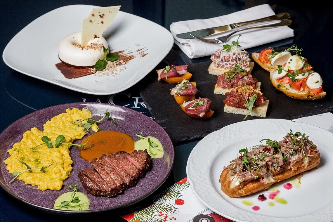 - Тартар говядина, копченая вишня, крем желток