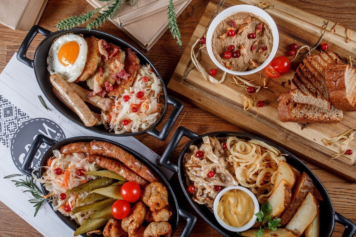 - Сковородка с колбасками: тушенная капуста со шкварками , колбаски, грибы в пивном кляре, маринованные овощи