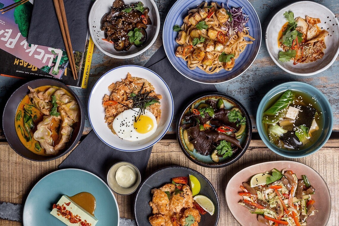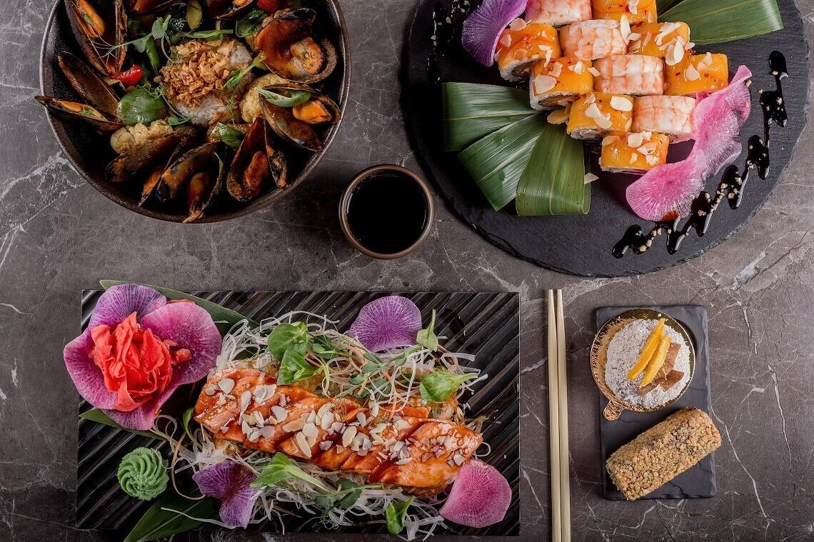 - Стир-фрай с голубыми мидиями: голубые мидии в створках, обжаренные в воке со шпинатом, цветной капустой, шампиньонами, цуккини, болгарским перцем, морковью, луком шалот, с соусами кимчи, тамариндовым и устричным, подаются с рисом жасмин