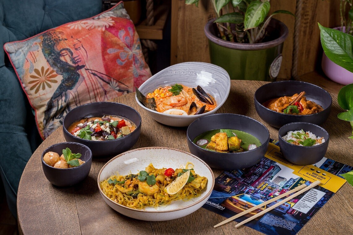 - Том Ям Рамен: насыщенный бульон Том Ям с китайской лапшой, мидиями, тигровыми креветками, кальмарами, шампиньонами, яйцом. Украшен свежей кинзой и острым чили перцем
