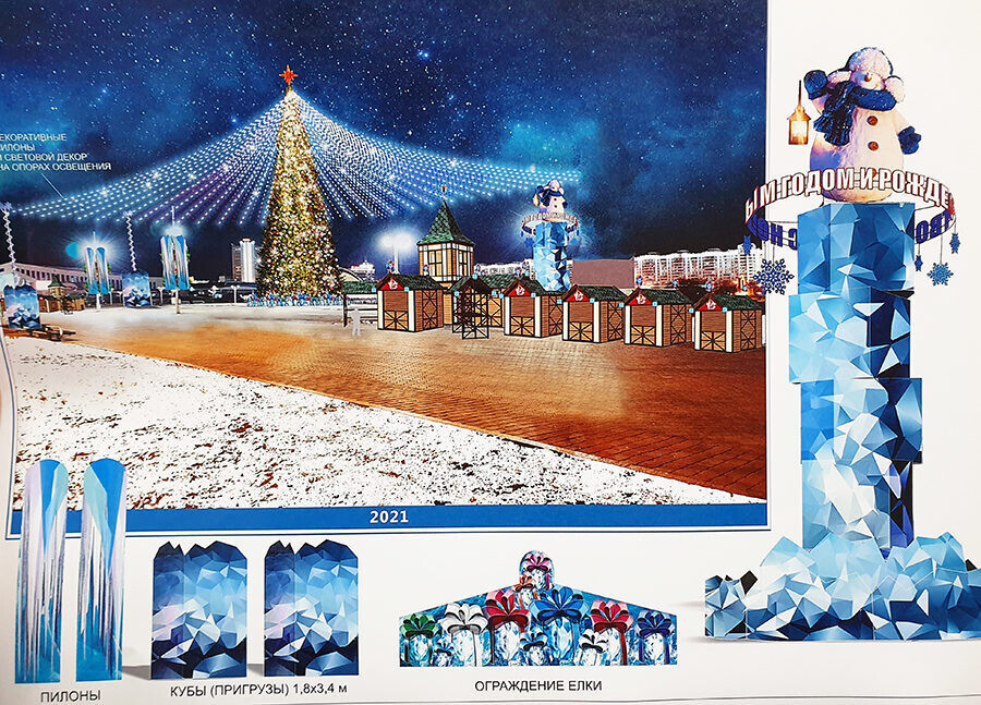 На Октябрьской площади также появятся световые арки и фотолокации с ледяными глыбами, санями, луной и облаками.