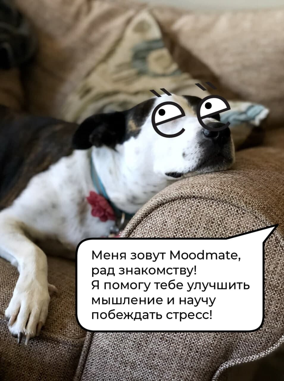 Moodmate ― это “тренер по настроению”. Задача бота ― научить пользователей действовать так, чтобы они легко побеждали стресс. Для этого бот ежедневно делится простыми короткими упражнениями. Эффект от них, как показывают исследования, можно будет почувствовать уже через 2 недели.