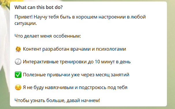 Занимаясь с ботом, пользователь узнает, как действовать в различных ситуациях, чтобы это улучшало настроение, а также формирует привычку. Ведь знать ещё не значит делать. Механика тренировок с ботом поможет начать применять знания в жизни.