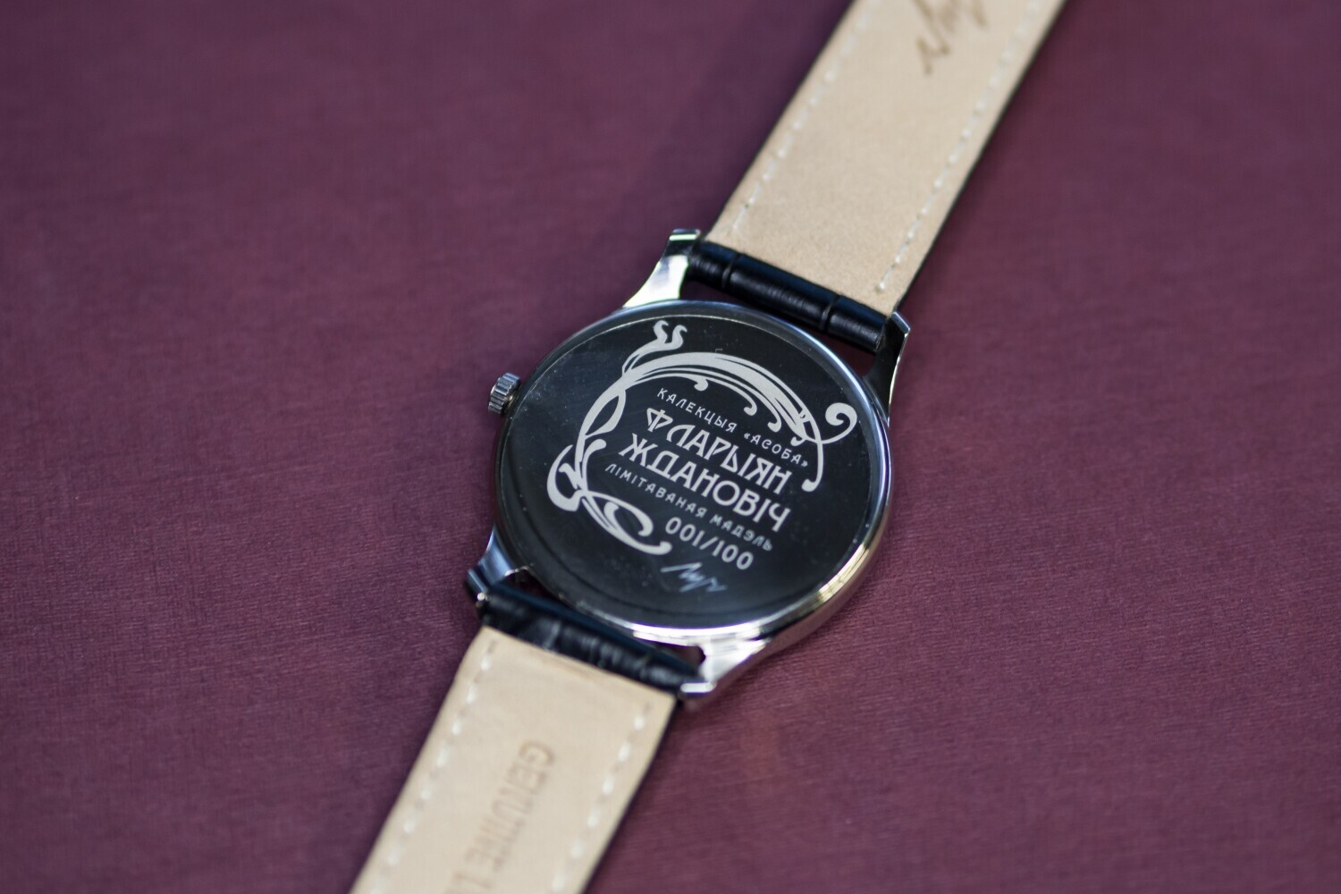 Характэрна, што цыферблат выкананы ў колеры заслоны Купалаўскага тэатра — глыбокім бардовым.