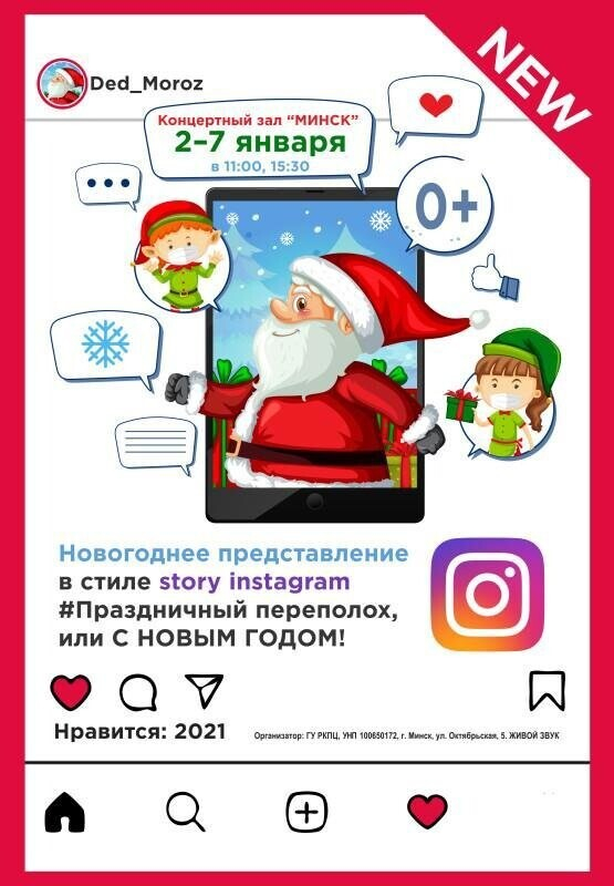 В праздничном новогоднем представлении для всей семьи в стиле #Праздничный переполох, или с Новым годом зрители станут свидетелями спасения новогодней сказки. В удивительное путешествие они отправятся вместе с Дедом Морозом, зайчиком и белочкой, которым доверили волшебный посох, а также с живущими в лесу Бабой Ягой, Лешим и знаменитыми блогерами, которые пойдут на любые ухищрения ради собственной популярности и хорошего селфи.