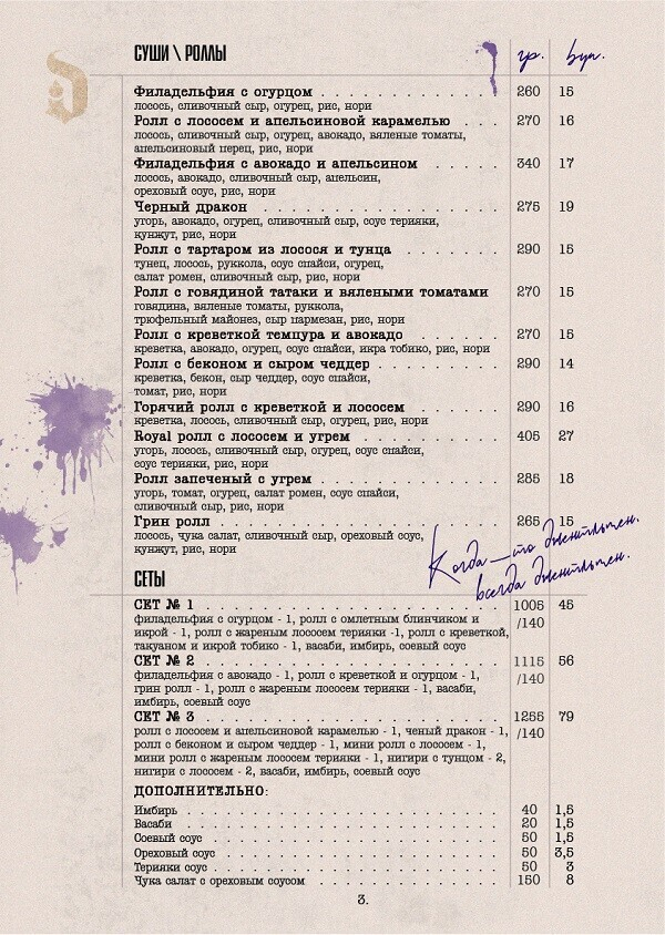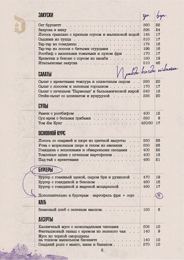 Добавились и новые закуски: «Сашими из тунца», «Закуска к вину» и «Сет брускетт» на поджаренном злаковом хлебе: брускетта с угрем терияки и шампиньонами, брускетта с томатами черри и чесноком конфи, брускетта с лососем и авокадо, брускетта с ростбифом и трюфельным майонезом.