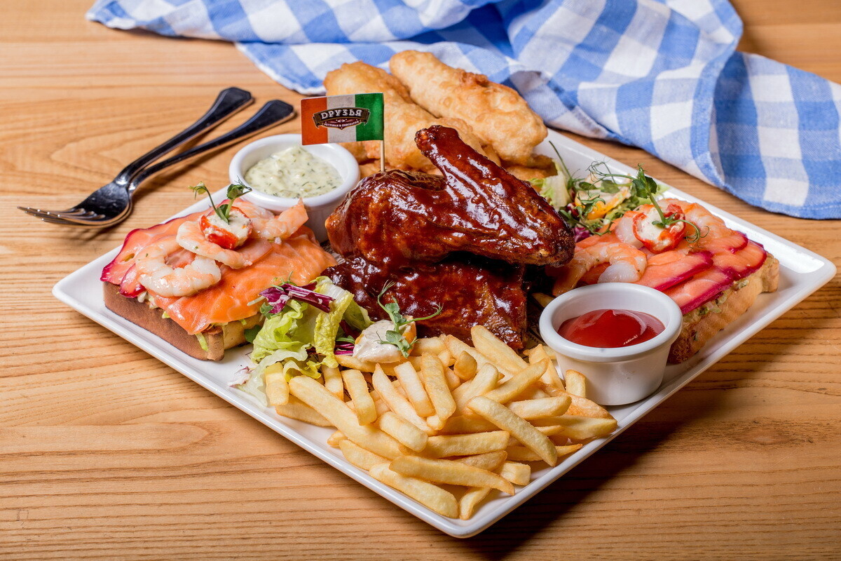 - Сморреброд по-ирландски с лососем и форелью шеф-посола, маринованными креветками, на хлебе собственной выпечки с яблочным соусом и хрустящим айсбергом