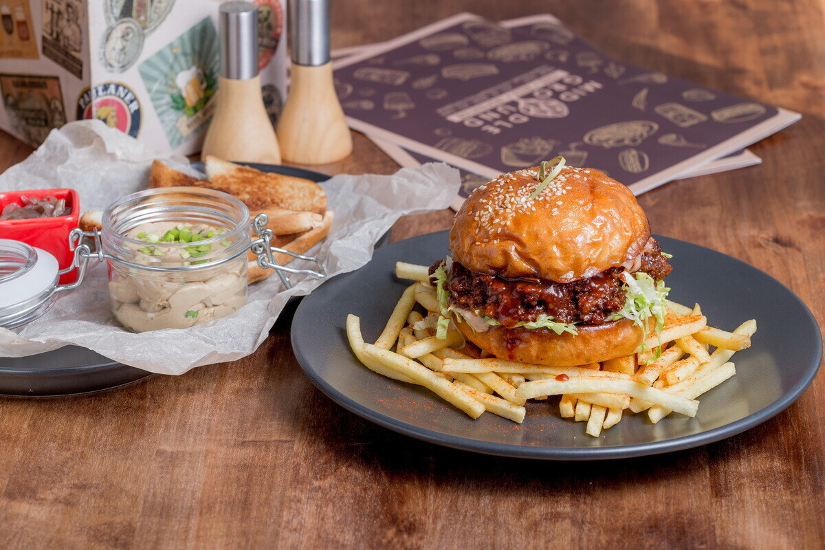 - Бургер Неряшливый Ирландец (фарш из говядины, копченый бекон, виски Jameson, Coca-Cola, овощи, домашний соус BBQ и фирменный с трюфельным маслом)