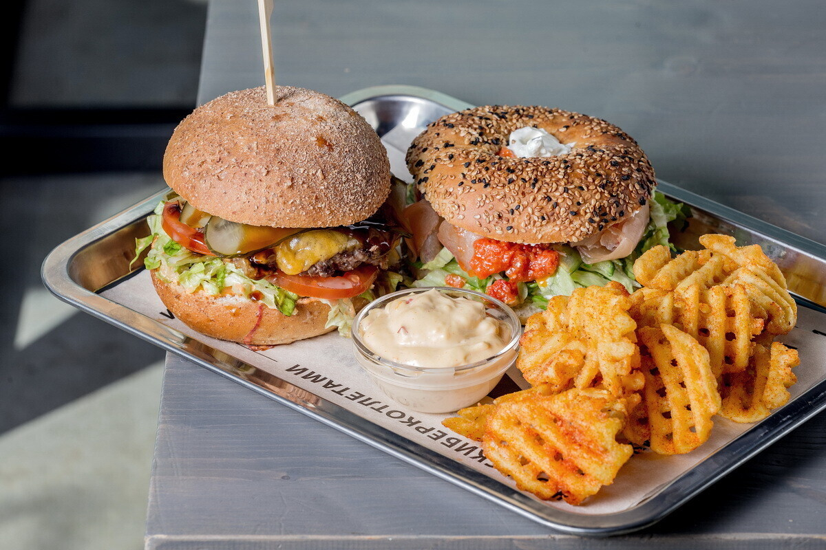 - Бургер из традиционного ирландского хлеба barmbread с говядиной, соусом Том Ям и Унаги, микс-салатом и соленым огурчиком