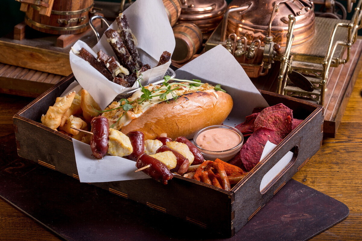 - Крафтовый хот-дог с говядиной в соусе BBQ на основе виски и дробленым начос