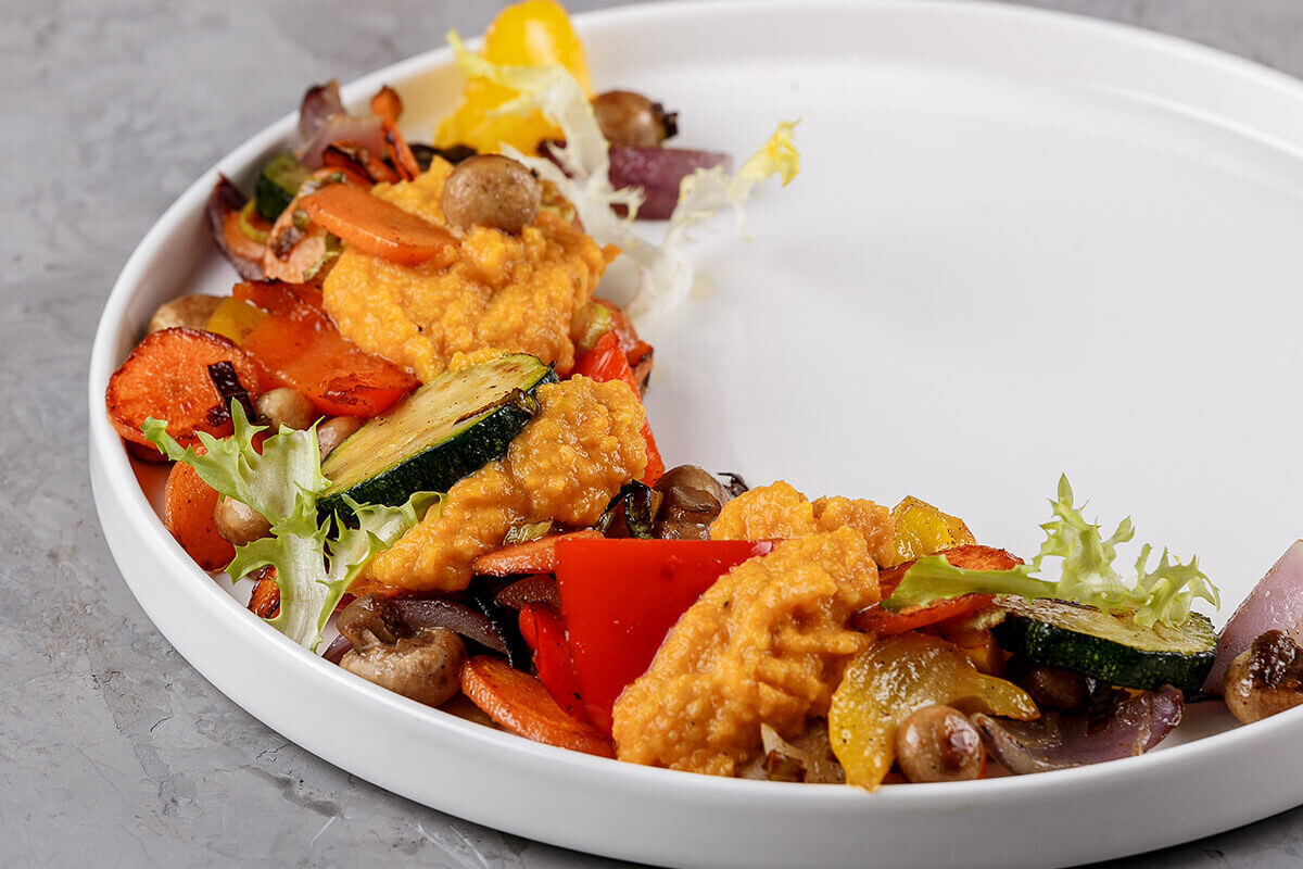 - Теплый овощной микс-салат из цукини, сладкого перца, шампиньонов, моркови, сельдерея, лука порея, чеснока, кабачковой икры (230 г/50 г/3 г/10 руб.).
